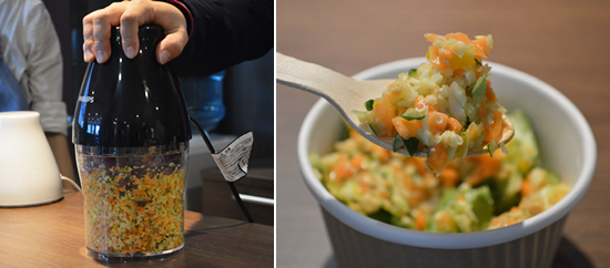 (左)本体を上から軽く押さえつける(右)スプーンですくえるチョップドサラダの完成、