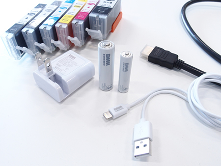 DMM.make BASICの第一弾として、電池、ライトニングケーブル、HDMIケーブル、