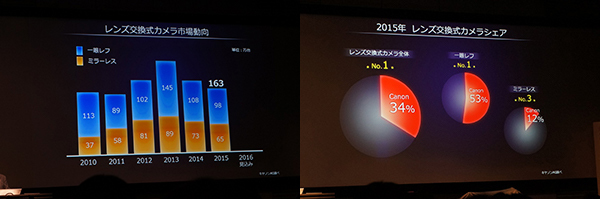 新製品発表会の冒頭で、キヤノンマーケティングジャパンの坂田正弘社長はデジタルカメラの国内市場動向について、「レンズ交換式カメラの出荷台 数は、消費増税の反動もあり、2014年の出荷台数181万台に対し、15年は163万台にまで減少したが、16年は15年と同程度の160万台の出荷数 になると想定している」との見解を明らかにした。