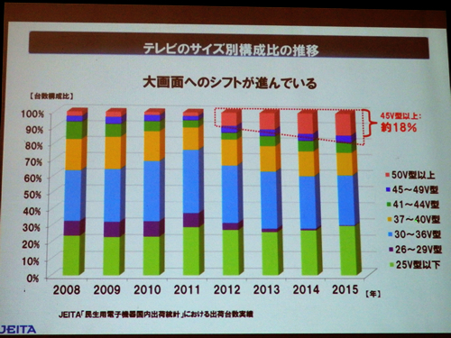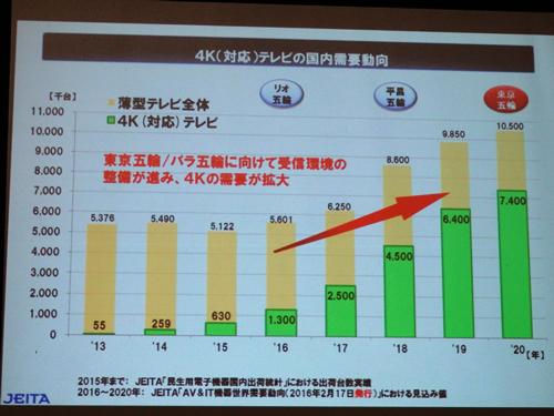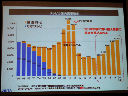 JEITAによると16年は560万台を予想し、それ以降は18年に860万台、19年に985万台、20年に1050万台と上昇していくと予測する。 根拠とするのが、ピークだった2010年を基点にして、ユーザーのテレビの買替えサイクルの8年~10年を迎えるのが、2018年~2020年だからだ。