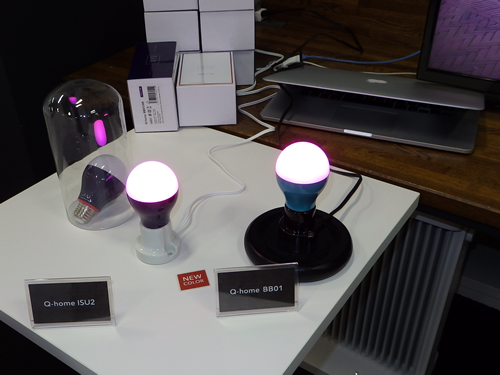 Bluetoothを搭載したスマート電球「Q-home BB01」は、新色「navy & red」を追加。スマホからワイヤレスで光の色や明るさを変えられる。価格は4800円。