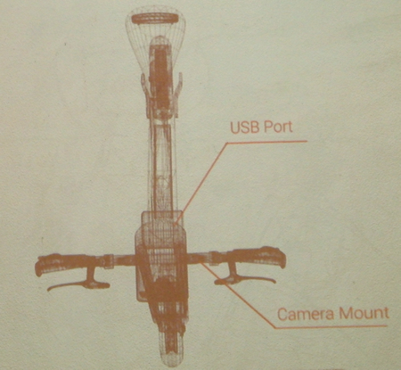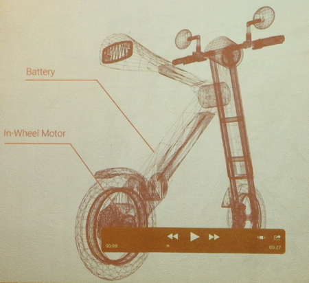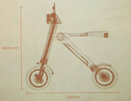 スケッチを見ると、ハンドルと前輪を支える支柱から真横にサドル、斜め後方に後輪が伸びるシンプルな構造であることがわかる。「モバイル電動スクー ター」というだけあって、サドルと後輪は折りたためる仕様のようだ。サイズは高さ985mm、長さ1200mmとなっている。