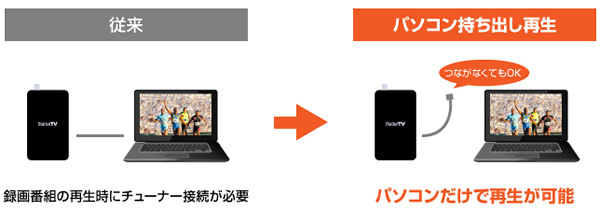 「パソコン持ち出し再生」機能に対応することで、録画番組の再生のためにチューナーを持ち運ぶ必要がなくなり、また録画番組の持ち出しのためのディスクへの書き出しの手間もかからなくなる。