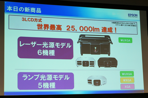エプソン販売は3月14日、3LDC方式で世界最高2万5000ルーメンの明るさを実現した高光束ビジネスプロジェクター「EBーL25000U」、 レーザー光源モデル「EBーL1000」シリーズ、ランプ光源モデルの「EBーG7000」シリーズなど、全11機種の常設プロジェクターを発表した。発 売は2016年5月下旬から、「EBーL25000U」は2016年12月に発売予定。