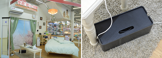 実際の寝室を再現し、寝具と合わせて家電を配置。