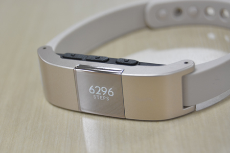 和泉社長の言葉通り、シンプルでさりげないデザイン。前モデルに比べてベルトが細くなっており凹凸がない。装着するとウェアラブルというより、女性向け のおしゃれな時計のように見える。新モデルから液晶ディスプレイを搭載したため、実際に時計の代わりにもなる。もちろん歩数や燃焼カロリーなどを表示する ことも可能だ。あらかじめ一日の活動量の目標値を設定しておけば、手元にスマートフォンがなくても達成度合いが分かるのでより便利になった。生活防水なの で、雨や水仕事など日常的な水濡れは気にしなくていい。