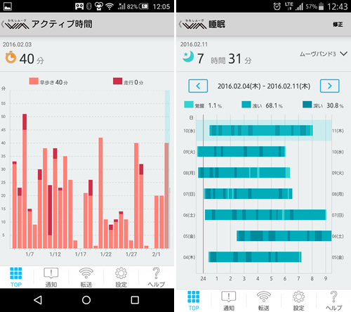 アクティブ時間や睡眠中の浅い眠り/深い眠りがわかる