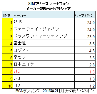 なお、家電量販店などの実売データを集計する「BCNランキング」で、SIMフリースマホの2月のメーカー別販売台数シェアを見るとZTEは1.5%で 8位。上位3社では、シェア24.0%のASUSが1位、24.0%のファーウェイが2位、23.9%のプラスワン・マーケティング(FREETEL)が 3位と3社とも20%を超えるシェアを獲得している。特にASUS、ファーウェイはずっと上位をキープしている。この牙城を崩すのは並大抵ではなく、それ ゆえ、ZTEがどのような戦略を取るか注目したい。(BCN・山下彰子)