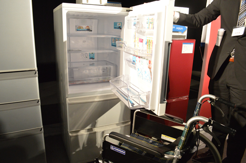 車いすの人でも使いやすい3段タイプの小型冷蔵庫「AQR-271E」