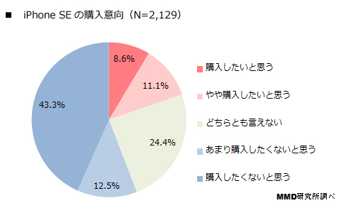 MMD研究所は3月25日、15歳~69歳の男女を対象に実施した「iPhone SEの購入意向調査」の結果を発表した。同調査は、2016年3月23日~3月24日に実施され、有効回答数は2129人。