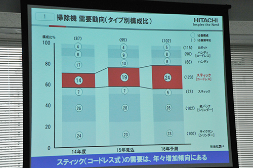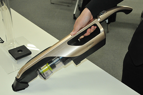 同社によると2016年度のクリーナーの需要は約470万台(前年度比102%)を予測。そのうちコードレス型のスティッククリーナーが24%を占めると読む。14年度は14%だった構成比が今後も伸びていくと期待する。
