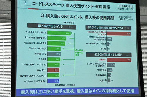 興味深いのは、サブ掃除機として見られがちなコードレスのスティック型クリーナーだが、同社の商品計画本部ユーティリティ商品企画部の湧廣修主任が「家 の中のメーン掃除機として使われている」と語るように、「PV-BC500」とほかの掃除機の使い分けについて聞いた項目では、「BC500をメーンの掃 除機として使う」が74%と突出している。家の中のメーン掃除機として使っている実態が明らかになった。