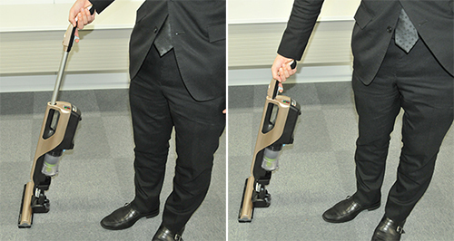 スティッククリーナーとして使用するときは、ゴミと空気を分離する「パワーブーストサイクロン」カップや「小型ハイパワーファンモーター」がヘッド近く の低い重心になる。これに日立ならではの回転ブラシの駆動力で自走する「自走 スマートヘッド」の動きが加わると、操作感は格段に軽く感じる。
