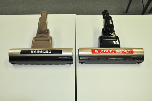 ヘッド幅約28cmのワイドヘッドは、ワンストロークの吸い込み面積が大きい分、掃除の時間短縮につながる。今回はヘッド先端に新たな「きわぴた」構造 を採用。ヘッド先端に空気の通り道を設けることで、取りにくかった壁ぎわのゴミを回転ブラシまでしっかり吸引できるようにした。