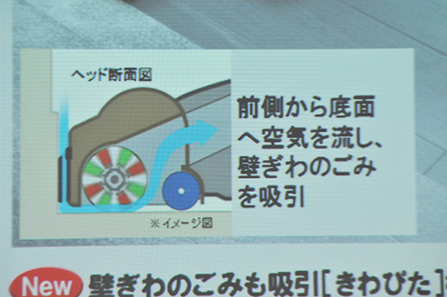 ヘッドの前から底面に空気を流しすことで壁ぎわのゴミをしっかりと吸引する