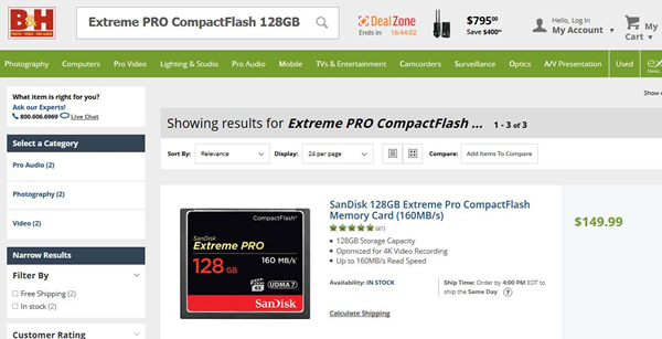 ここで、大木ディレクターは興味深いデータを見せてくれた。カメラ・レンズの海外通販で最も有名と思われる「B&H」のネット価格だ。その一つを紹介しよう。国内での平均単価が4万1500円だったサンディスクの「Extreme PRO CompactFlash 128GB」が、149.99米国ドル(4月15日時点)で販売されている。1ドル110円で換算した場合は1万6500円ほどだ。流通経費が加わったとしても倍以上の開きがある。このように高価格帯のメモリカードは海外サイトで購入した方が安いので、プロカメラマンの中には個人輸入している人もいるほどだ。