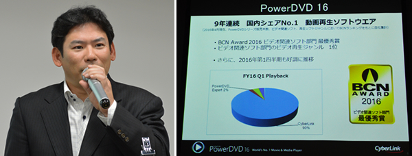 萩原英知チャネルセールスディレクターは「動画再生ソフトにおいては9年連続で販売本数シェアトップを継続しており、16年第一四半期もシェア90%を獲得することができた」とビジネスの堅調な推移を説明。販売本数も右肩上がりで、15年は前年比で113.5%を記録したことを発表した。