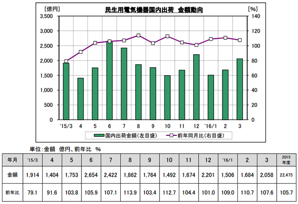 一般社団法人日本電機工業会(JEMA)は4月20日、2015年度(15年4月~16年3月)の白物家電の国内出荷金額が前年度比105.7%の2兆2475億円だったと発表した。2年ぶりのプラスとなった。