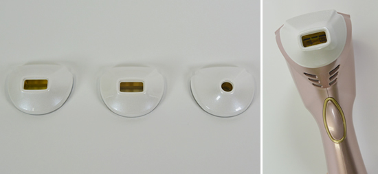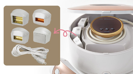 脚、腕、お腹など広い部位に適した「ラージランプ」、ビキニエリアや指などの狭く凹凸のある部位に適した「スモールランプ」、顔の産毛ケア&スキンケアが可能な「フェイスランプ」の3種類が付属する。 また、オプションで「クールヘッド」を購入すれば照射後に熱を持った肌を冷やすことができる。