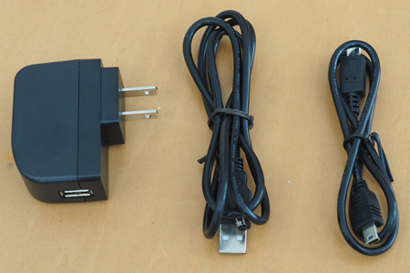 電源用のUSBケーブル、ACアダプタとAndroid端末と接続できるUSBケーブルが付属する