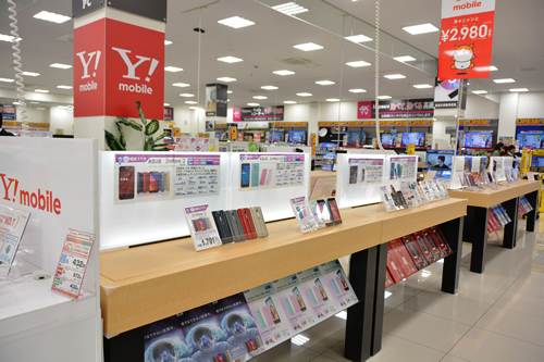 2階のエスカレーター近くの入り口前にはメイン通りが並び、スマートフォンコーナー、理美容家電コーナーが並ぶ。萩野店長は「店舗周辺には団地が建ち並び、ご家族のお客様が多い。家族の携帯電話料金を見直そうとY!mobileや格安スマホのニーズが高いだろうと思い、一番目立つところにコーナーを設けた」と説明した。