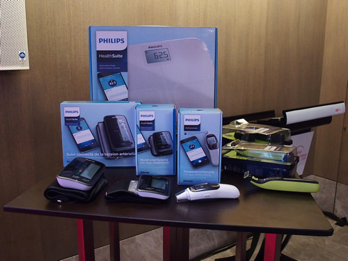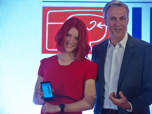 ヘルスウォッチとスマホを報道陣にお披露目するミスIFA(左)と医療コストの低減を実現すると語る、フィリップスのフィリップスのBernd Laudahn マネージングディレクター