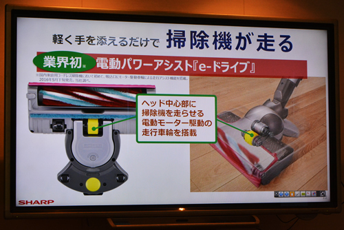 シャープは、スティック型のコードレスサイクロン掃除機「POWER CYCLONE FREED EC-SX520」を5月下旬に発売する。業界初の電動パワーアシスト機能「e-ドライブ」をヘッドに搭載し、床面を選ばずに軽い力で掃除ができる。価格はオープンで、税別の実勢価格は8万5000円前後の見込み。