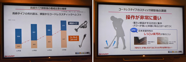 掃除機の市場動向(左)とコードレス掃除機の課題