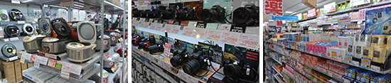 店内には、海外でも使える炊飯器(左)のほか、高価格帯のカメラ(中)や薬(右)などが並ぶ。