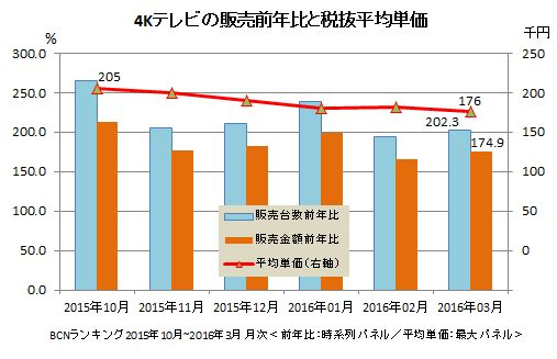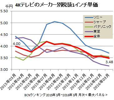 平均インチサイズが昨年3月の51.2型からこの3月の50.6型と小型化が進んだことに加え、1インチあたりの単価が1年で13%下落して、3月に 3480円と初めて3500円を割り込んだ。40型以上で非4Kの液晶テレビの1インチ単価は1750円。3年前は4.5倍もあった1位インチ単価の差は 2倍以内に縮まり、4Kテレビが多くの消費者の買い換えターゲットに入ってきた。
