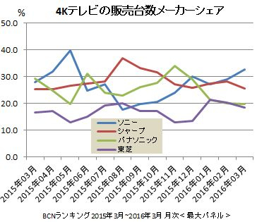 一方、最もインチ単価が安いのは東芝で3150円。全体の平均インチ単価3500円割れを強力にドライブしたのは東芝だった。4Kテレビの平均単価も 15万5000円と主要メーカーでは最も安いものの、販売台数シェアは18.3%とふるわない。不正会計問題によるブランドイメージの毀損が影響している 可能性が高い。