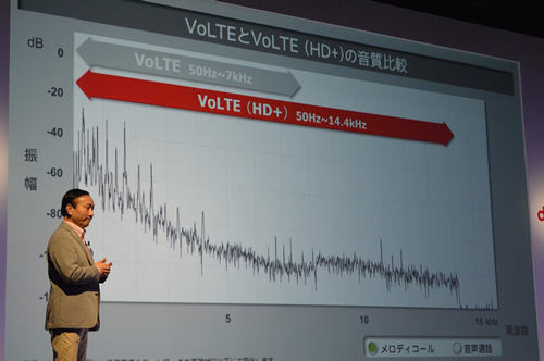 「VoLTE(HD+)」は、2014年6月に日本で初めてドコモが導入した音声サービス「VoLTE」の次世代規格。ドコモが標準化に参画した次世代通話用コーデック技術EVSを活用することで、「VoLTE」よりさらに広帯域の音声周波数を音声で伝えられるようになった。
