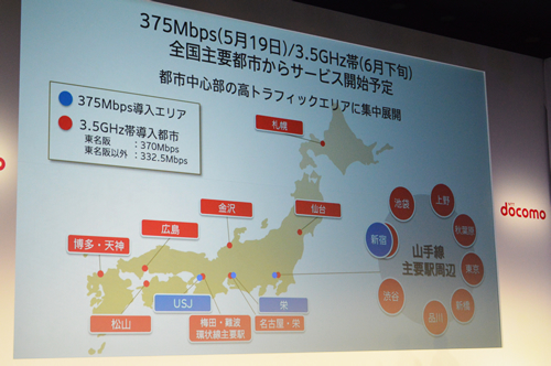 「Premium 4G」は、現在のLTEネットワークで利用している帯域に3.5GHzが加わることで実現。既存周波数と組み合わせて最大370Mbpsの高速データ通信を実現する。またキャリアアグリゲーションを強化し、2GHz帯と1.7GHz帯に800MHz帯を束ねることで、国内最速の受信時最大375Mbpsも実現。3.5GHz帯は6月下旬から全国主要都市で導入、375Mbpsは5月19日から当初は東京・新宿周辺、愛知・栄市、大阪・USJに絞って導入する。