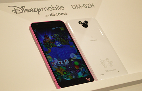 ディズニーモバイルとのコラボレーションモデル「Disney Mobile on docomo DM-02H」は、背面にミッキーとミニーのデザイン、前面にはスワロフスキー・クリスタルストーンのミッキーアイコンをデコレーション。着信時には背面にハートのイルミネーションが浮かぶなど、凝った演出を満載する。