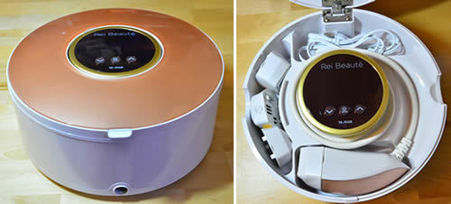 「レイボーテ グランデ」は、直径26cmの円柱状のボディで、見た目はまるでおしゃれなロボット掃除機か、茶器のよう。パカッと本体を開くと、光を照射するプローブや電源ケーブル、ランプなどを収納しています。光美容器の利用頻度は、数週間に一度。そのため、かさばらずにしまっておける収納性も、商品選びの重要な要素。まるでインテリアのようにスタイリッシュなボディの「レイボーテ グランデ」は、その条件を立派に満たしているといえるでしょう。