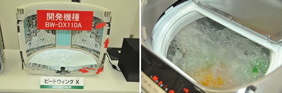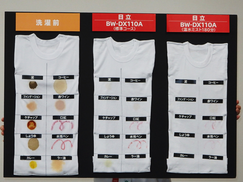 さらに「[温水]ナイアガラ ビート洗浄」は、とかした洗剤を衣類に散布した後、「温風ミスト」を衣類に振りそそぐ。「温風ミスト」は、水に温風をあてながらつくる。この「温風ミス ト」を約180分、衣類に吹き付けることで、洗剤の酵素パワーが活性化する約30~40℃に衣類が温まり、衣類に付着した黄ばみまで落とすことができると いう。