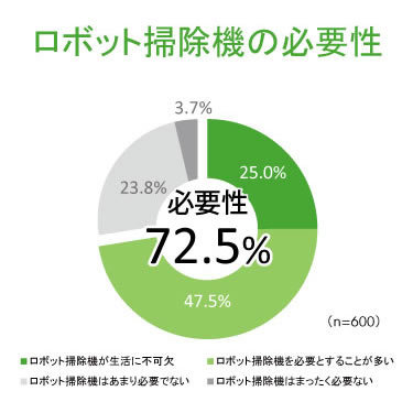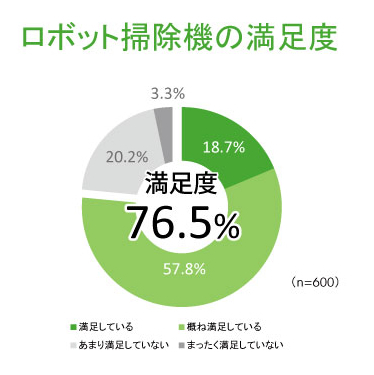 ロボット掃除機の満足度についての質問では、「満足している」(18.7%)、「概ね満足している」(57.8%)を合わせた76.5%が「満足してい る」と回答しており、ロボット掃除機の必要性に関しては、「生活に不可欠」(25.0%)、「必要とすることが多い」(47.5%)を合わせた72.5% が必要性を感じている。
