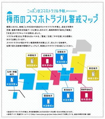 KDDIが展開するスマートフォン(スマホ)にまつわるトラブルを予報するWebコンテンツ「ニッポンのスマホトラブル予報」は、6月6日、全国8エリアの「梅雨のスマホトラブル警戒マップ」を公開した。