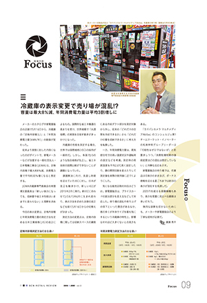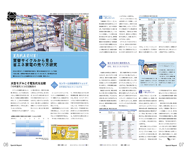 特集は夏商戦直前対策! 「買替サイクルから見る 省エネ家電の売り方研究」。エアコン、冷蔵庫の主要モデルの3年前、5年前、10年前モデルを徹底比較。電気代の差額を明らかにして「10年選手」に引退勧告! 省エネ家電の販売手法を研究する。