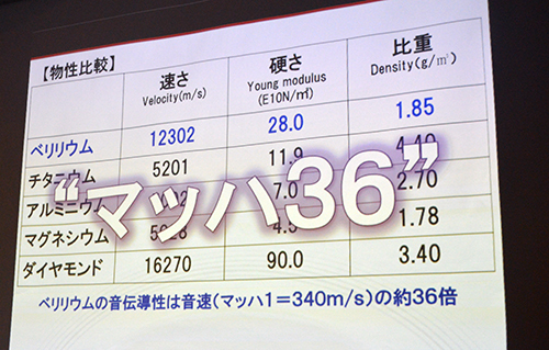 新製品のキーワードとなっている“マッハ36”は、音伝導性の速さに由来する。ベリリウムの音伝導性は、音速(1マッハ=340m/秒)の約36倍、ゆえに“マッハ36”。ベリリウムは各音響メーカーが発表してきた100万円を優に超えるフラッグシップスピーカーが採用してきた素材で、実績も十分だ。