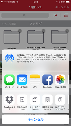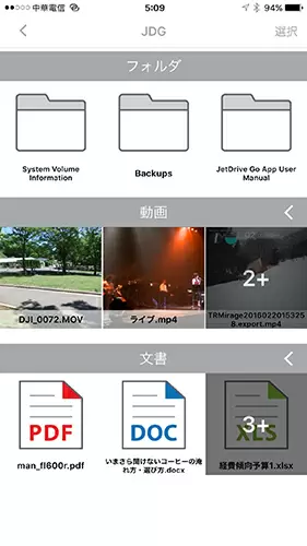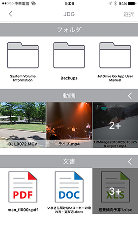 「JetDrive Go」を開くと保存したファイルをカテゴリ別で一覧表示