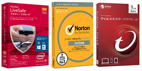 左からマカフィーの「マカフィー リブセーフ」、ノートンの「ノートン セキュリティ プレミアム」、