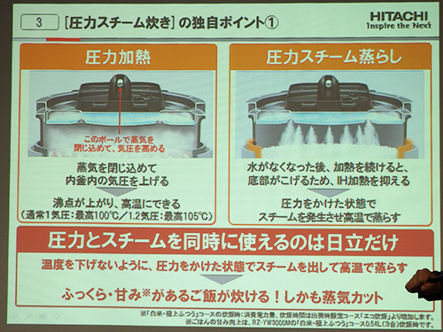 日立の「ふっくら御膳シリーズ」は、1.2気圧の圧力を掛けながら加熱して、蒸らし時に圧力とスチームの両方を加える「圧力スチーム炊き」が特徴だ。「RZ-YW3000M」では、昨年モデルの「RZ-WW3000M」と炊飯工程を変えることで甘みをアップさせた。