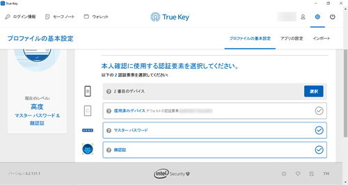 一般的なパスワード管理ツールのログイン要素は「マスターパスワード」だけだが、「True Key」は、顔や指紋の生体認証など複数のログイン要素を設定できるのが特徴。PCのウェブカメラで読み取った顔のデータを登録すれば、次回からウェブカメラに顔面を映すだけで瞬時にログインできる。指紋も同様で、登録さえしておけば、次回の利用時は読み取るだけ。マスターパスワードより流出の危険が少なく、正確に覚えておく必要すらないので安全性・快適性ともに高い。