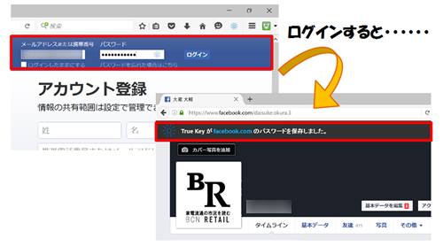 実際に、よくアクセスするウェブサイトのID・パスワードを「True Key」に登録してみた。まずは、「True Key」と連動するブラウザ経由でFacebookにアクセス。ログイン画面でメールアドレスとパスワードを入力する。ここで気がつくのが、メールアドレスとパスワードの入力画面端に表示されるブルーの「True Key」マーク。これは、アクセスしているサイトが「True Key」で登録できるサイトである証だ。ログインに成功すると、「True Keyがfacebook.comのパスワードを保存しました」というポップアップが表示される。これで登録作業は完了。次回からは「True Key」にさえログインすれば、FacebookのID・パスワード入力を省略することができる。