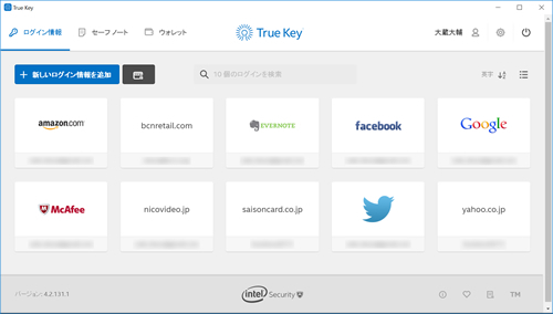 ほかのサイトでも登録方法は同様だ。通常の使い方をしていれば、自然に「True Key」の登録サイトは増えていく。もし、過去にパスワード管理ツールを使用していれば、その登録データを「True Key」にインポートすることも可能。登録データはメイン画面から一覧で確認できる。