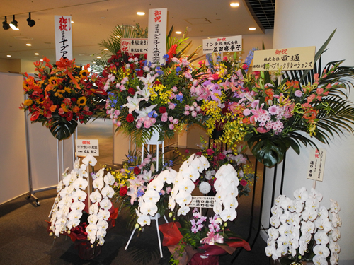 ダイワボウ情報システムなどからのお祝い花が並ぶ