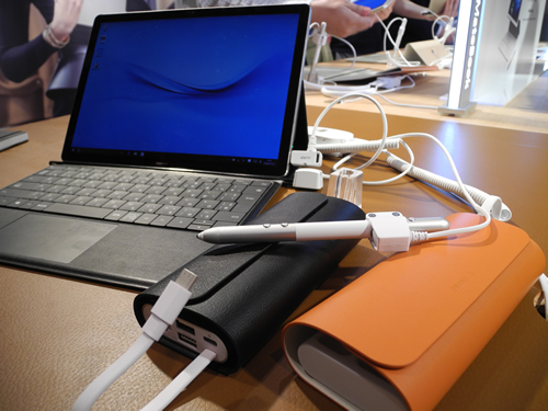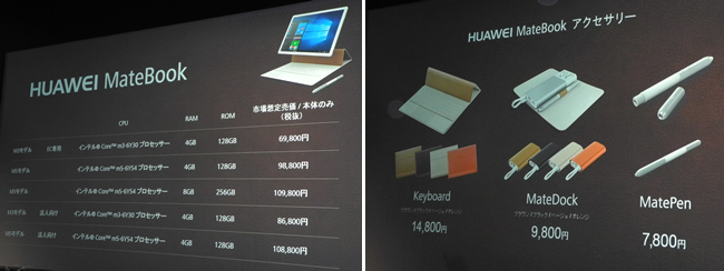 オプションとして7800円で提供する「HUAWEI MatePen」はワコムと連携して提供。タッチペンとしてだけでなくレーザーポインターやスライドページの送り/戻しも可能で、1時間の充電で約1か月使用できる。9800円で提供する「HUAWEI MateDock」はUSBポートやD-sub15ピン/HDMIでの外部出力、LANポートなど、さまざまなインターフェイスを一つのドックに集約している。1万4800円で提供する「MateBookキーボード」はブラック、ブラウン、オレンジ、ベージュの4カラー。