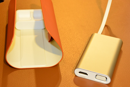 USBポートやD-sub15ピン/HDMIでの外部出力、LANポートなど多彩なインターフェースを一つにまとめた「HUAWEI MateDock」を使うと、外出先や出張先でも快適に作業できる。カラーは、キーボードと同じ4色。