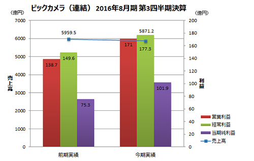 ビックカメラ、白物家電が伸びる、2016年8月期の第3四半期決算